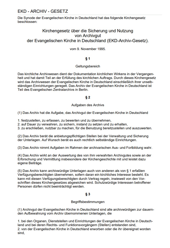 Das EKD-Archivgesetz bildet den rechtlichen Rahmen unserer Arbeit. Es ist den staatlichen Archivgesetzen nachgeformt und entspricht weitgehend dem damaligen Bundesarchivgesetz. Das EKD-Archivgesetz definiert die Aufgaben des Archivs, gibt die Kriterien für die wichtige Aufgabe der Bewertung von behördlichem Schriftgut vor und legt die Bedingungen für die Benutzung von Archivgut durch Dritte fest. Außerdem legitimiert das Gesetz das Archiv zur dauerhaften Speicherung personenbezogener Daten außerhalb des ursprünglichen Erhebungszwecks. Als bereichsspezifisches Gesetz geht das Archvgesetz dem EKD-Datenschutzgesetz vor.
